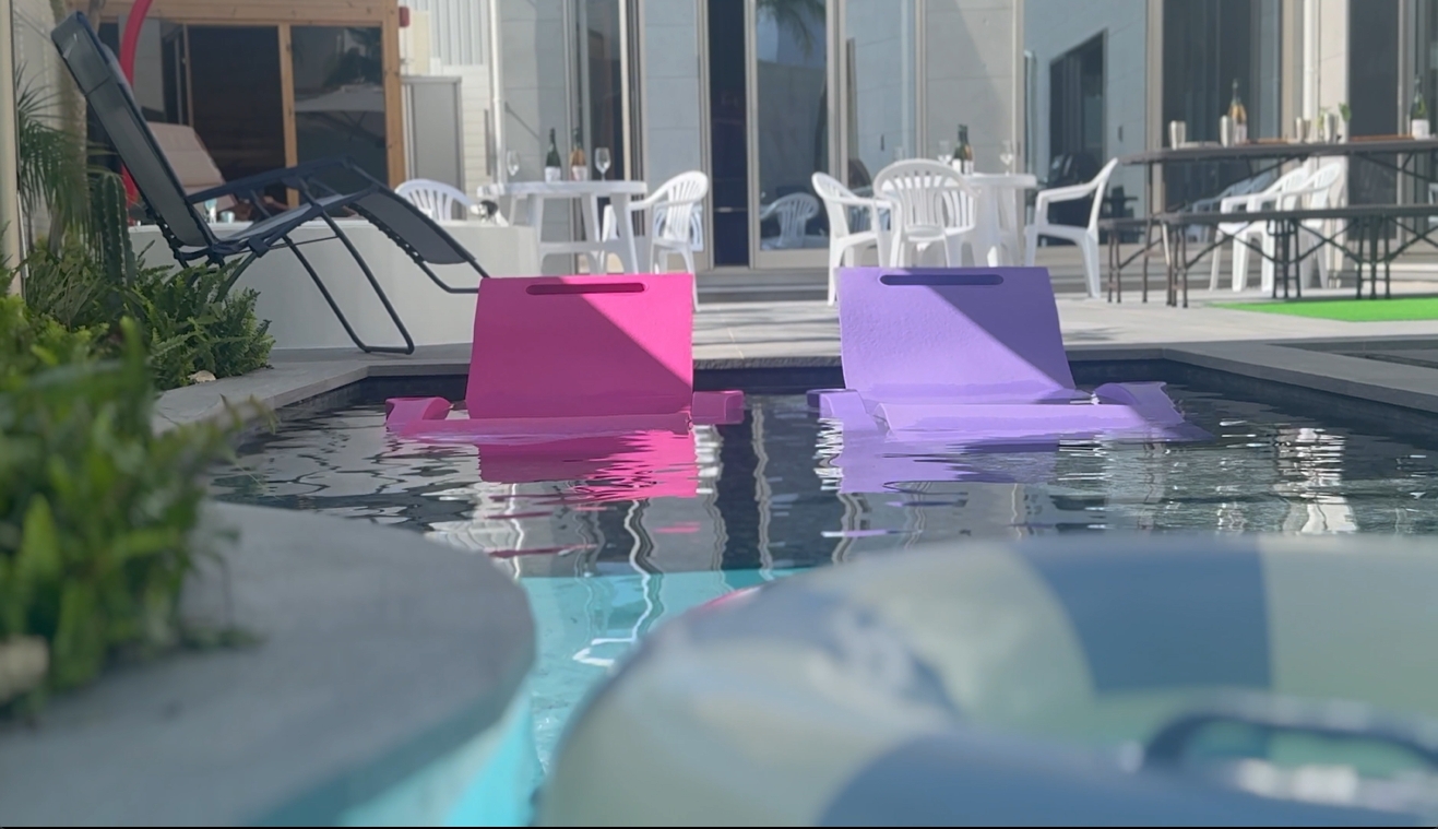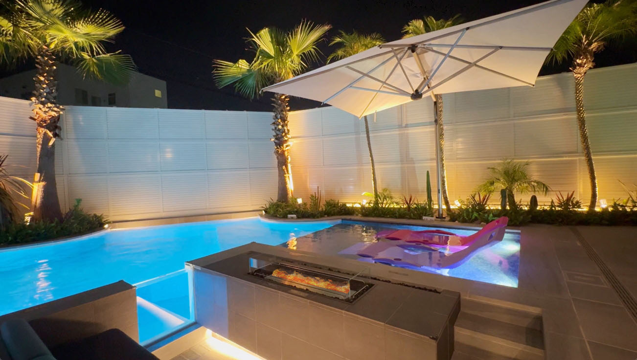 ※1:温水化可能/ヒートポンプ・ソーラーシャワー ※2:アルケマデザイン/テーブル・チェアー・屋根付 ※3:真夏の清涼&幻想的なプール景観 ※4:アルケマシャワー