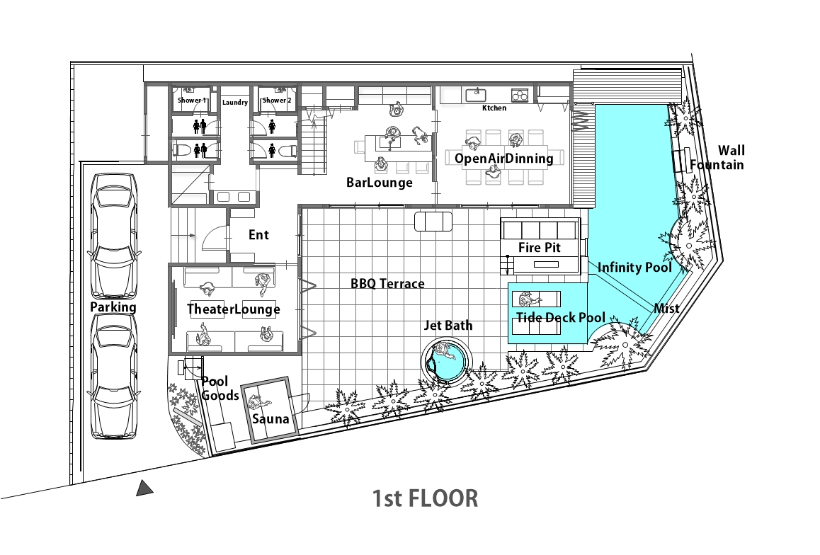 4LDK、木造2階建て、延べ床面積:154㎡、インフィニティ温水プール・サウナ・ジャグジー・ファイヤーピット・オープンエアダイニング・シアターラウンジ・バーラウンジ、宿泊最大定員:12名(シングルベッド×4、セミダブルベッド×4)、日帰り最大定員:20名